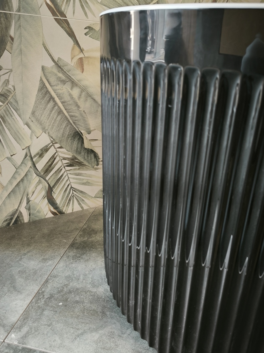 Tendance Cannelée : Le tablier extérieur arbore un motif cannelé (ou à rainures verticales) audacieux qui joue avec la lumière, ajoutant une profondeur et un caractère unique à la baignoire.