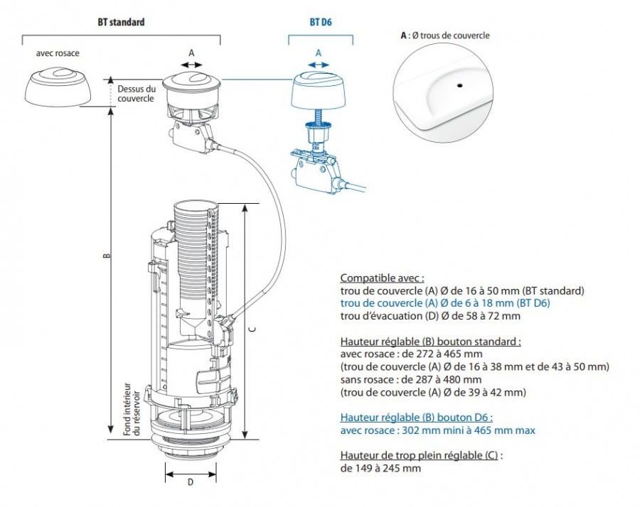 Ce nouveau bouton permet le passage de la double commande dans un trou de couvercle de seulement 6 mm (anciens réservoirs équipés de mécanismes à tirette)