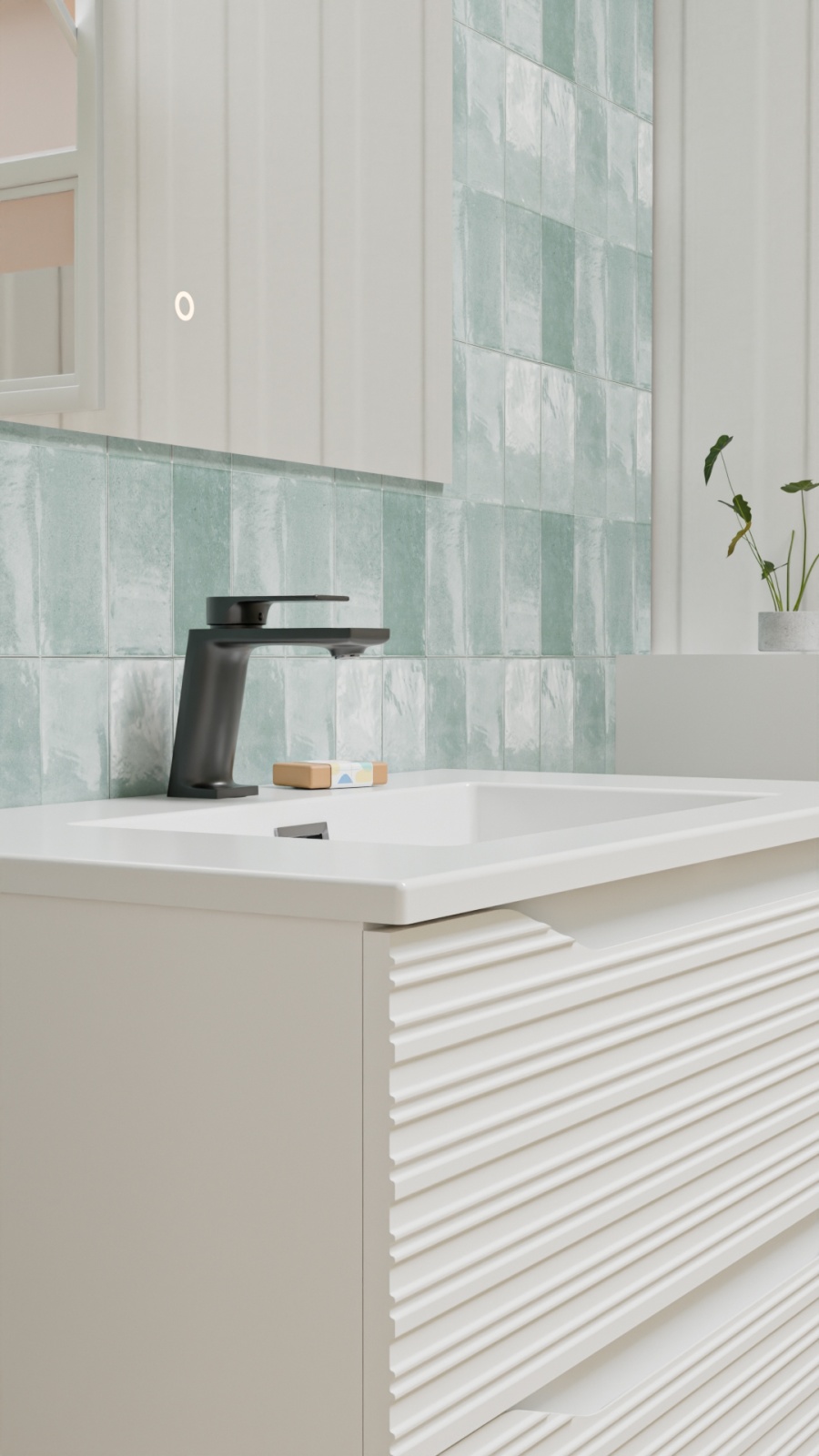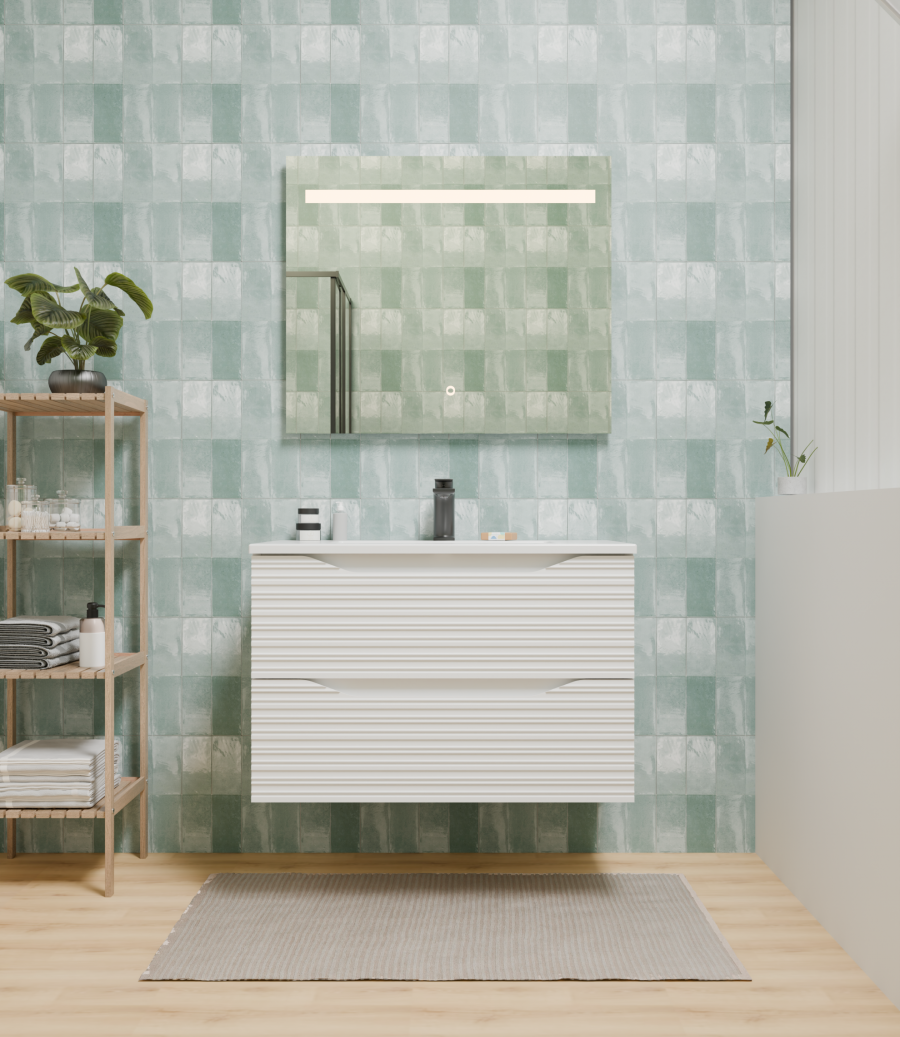 La véritable signature du modèle Structura réside dans ses façades structurées. Les lignes horizontales en relief créent un rythme visuel dynamique qui accroche la lumière, rompant avec la monotonie des meubles de salle de bain classiques. Son coloris blanc brillant renforce cet aspect moderne tout en facilitant l'entretien au quotidien.
