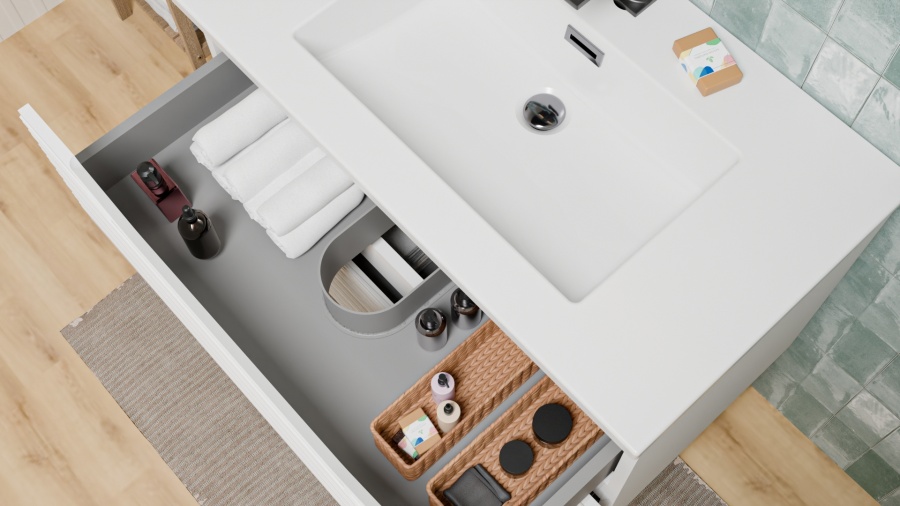 Découpe pour siphon : Le tiroir supérieur est astucieusement conçu pour laisser passer la robinetterie sans sacrifier l'espace de stockage.