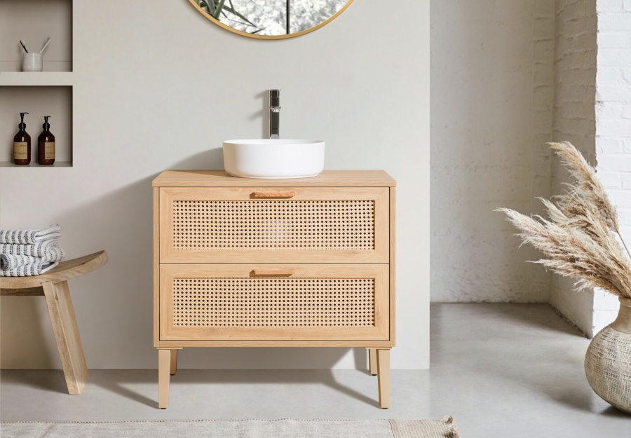 Donnez un cachet unique à votre salle de bains avec ce magnifique meuble sous-vasque de 80 cm, alliant la chaleur du chêne clair au charme intemporel du cannage.
