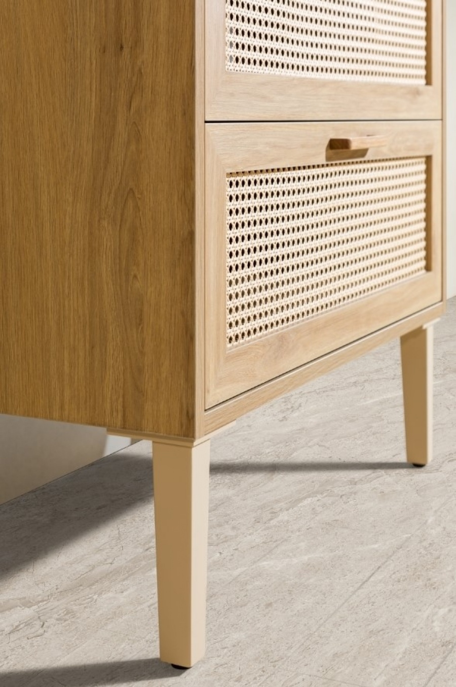 Reposant sur des pieds fins et modernes, le meuble offre une allure aérienne et facilite le nettoyage au sol.