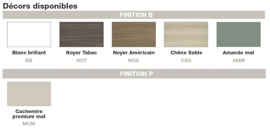 En constante innovation, nous vous proposons un large choix de meubles aux matières et couleurs tendances avec des finitions au toucher naturel incroyable. Découvrez notre vaste sélection de finitions (mélaminé, stratifié, laque…) et de coloris unis brillants et mats ou décors bois, qui peuvent être combinés.