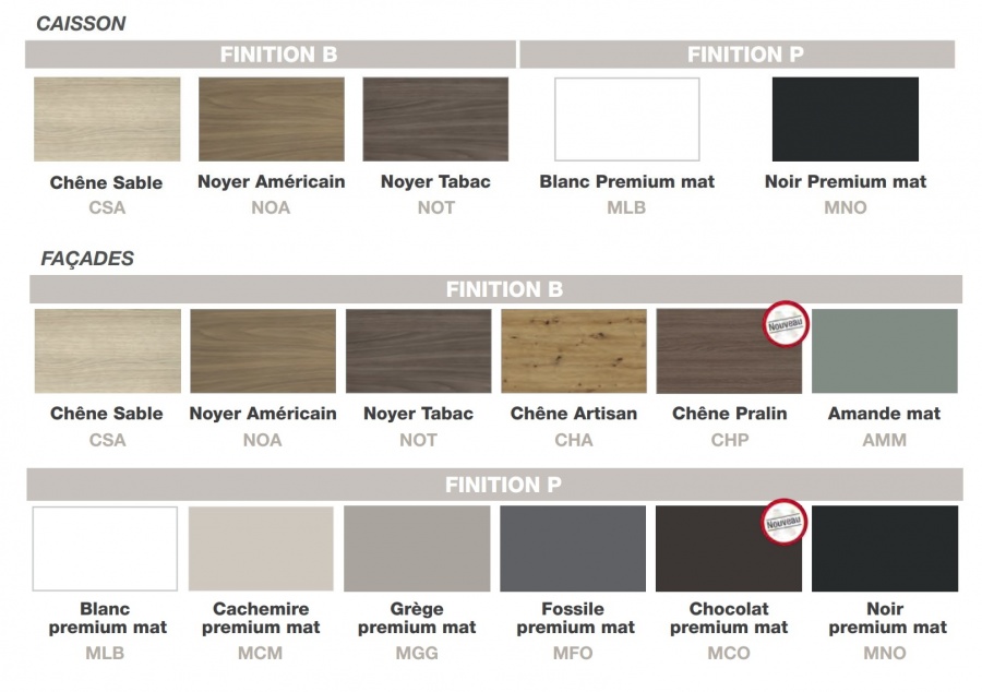 En constante innovation, nous vous proposons un large choix de meubles aux matières et couleurs tendances avec des finitions au toucher naturel incroyable. Découvrez notre vaste sélection de finitions (mélaminé, stratifié, laque…) et de coloris unis brillants et mats ou décors bois, qui peuvent être combinés.