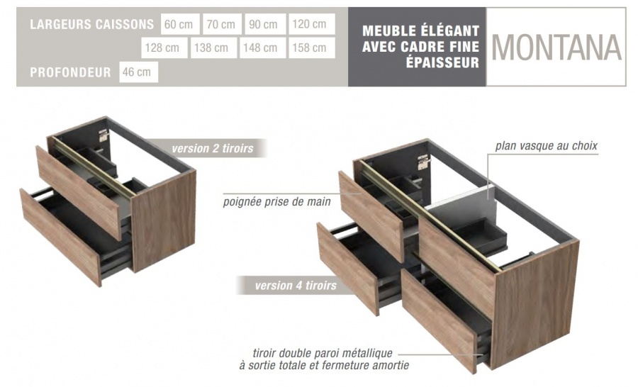 Le meuble Montana est compatible avec trois types de plans vasques pour couronner votre installation :