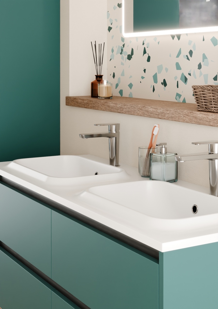 Les formes contemporaines de la double vasque DUNE et sa couleur blanc pur s'intègrent parfaitement à tous les styles de salle de bain design, des plus minimalistes aux plus sophistiqués.