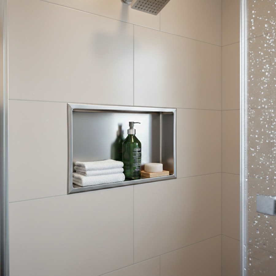 La niche en acier inoxydable élargit l'espace de rangement de votre salle de bain tout en la rendant confortable et moderne.