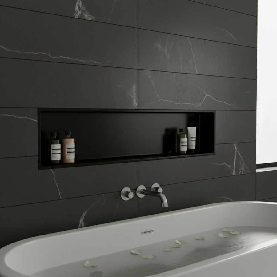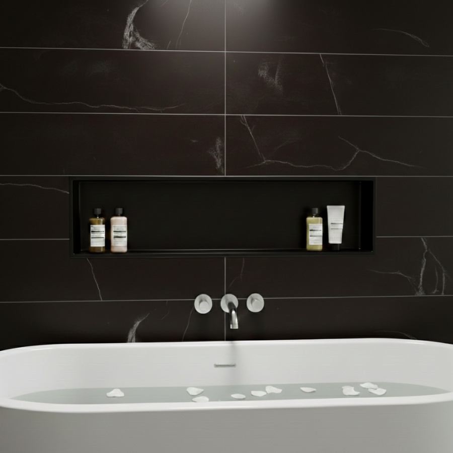 Une niche murale s'intègre dans le mur et peut soit être utilisée comme espace de stockage pour vos produits de bain, de douche ou de cosmétiques ou comme décoration.
