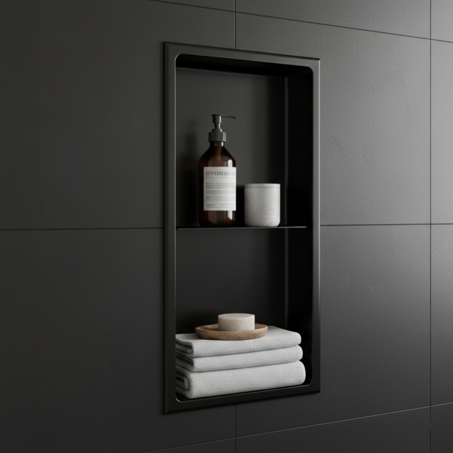 Une niche murale s'intègre dans le mur et peut soit être utilisée comme espace de stockage pour vos produits de bain, de douche ou de cosmétiques ou comme décoration.