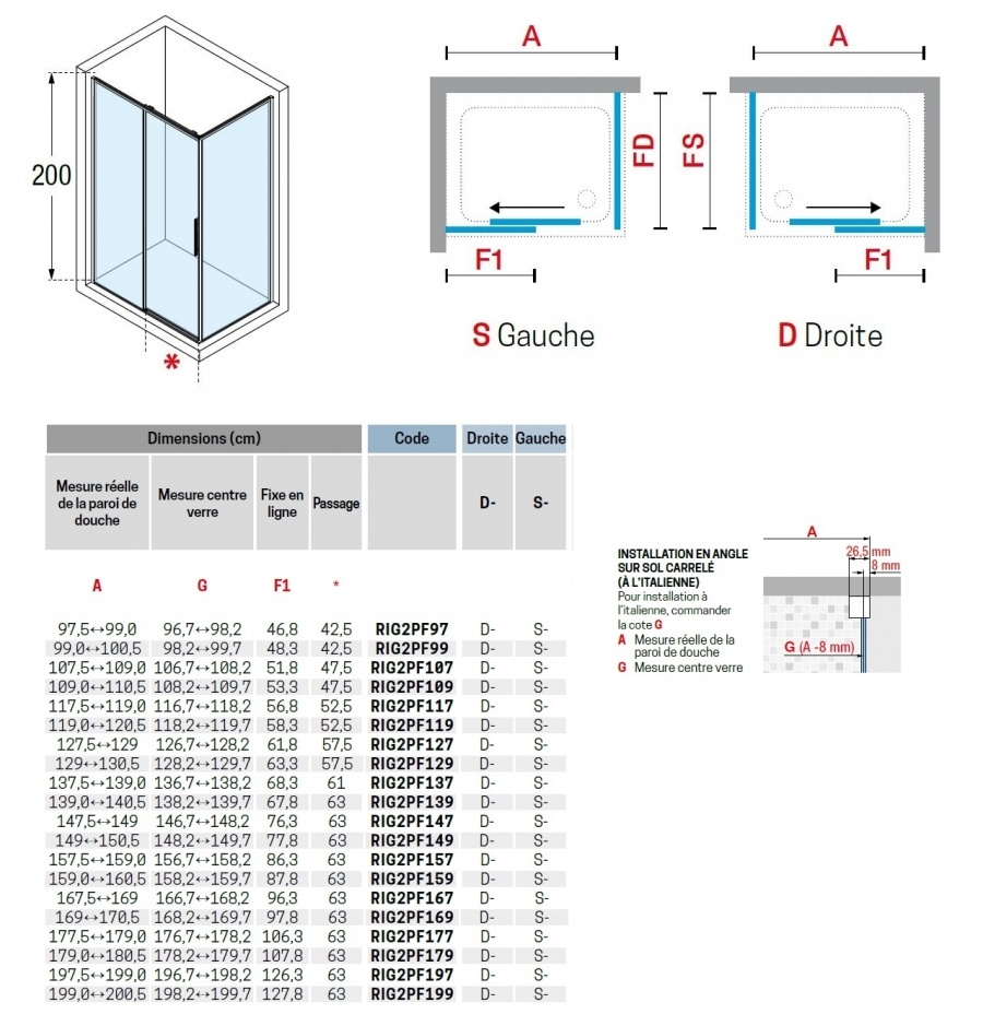 Ouverture de la porte de douche 1 porte coulissante et 1 porte fixe en ligne + 1 paroi latérale fixe (en option)