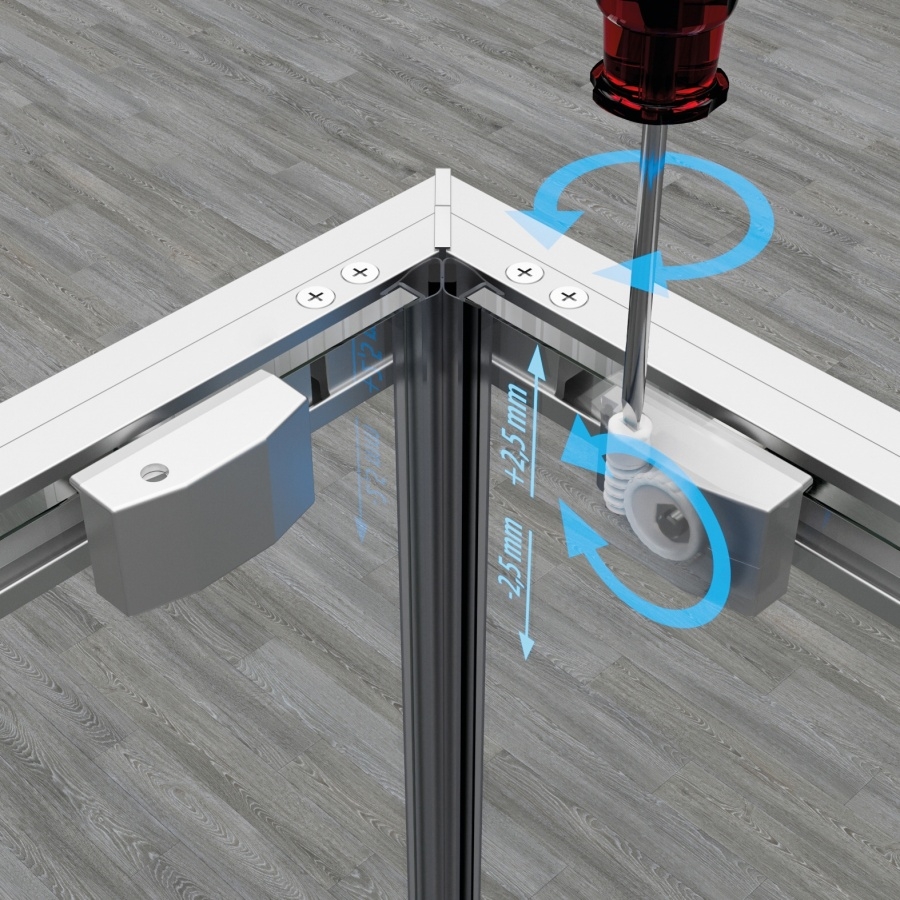 La cabine de douche Riga se distingue par la jonction des profilés supérieurs, réalisée à un angle de 45 degrés. Le verre fixe avec des profilés en aluminium est de la même épaisseur que la porte. Les charnières sont en métal de haute qualité, garantissant une solidité et une fiabilité sans compromis.
