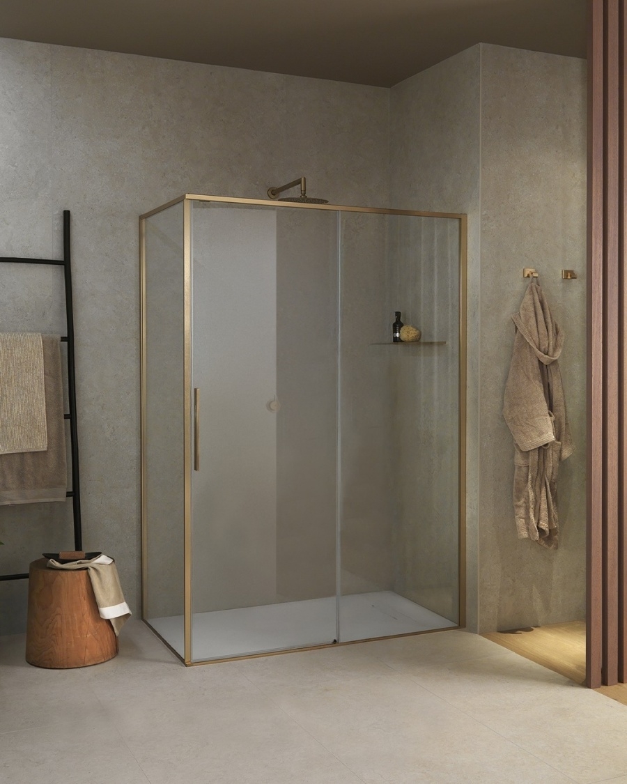 Paroi de douche d'angle coulissante RIGA 2P+F - Or brossé - 140cm - Droite (Finition profils paroi : Autres , Sens d'ouverture : De gauche à droite , Taille Paroi douche : 140 cm )