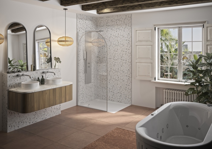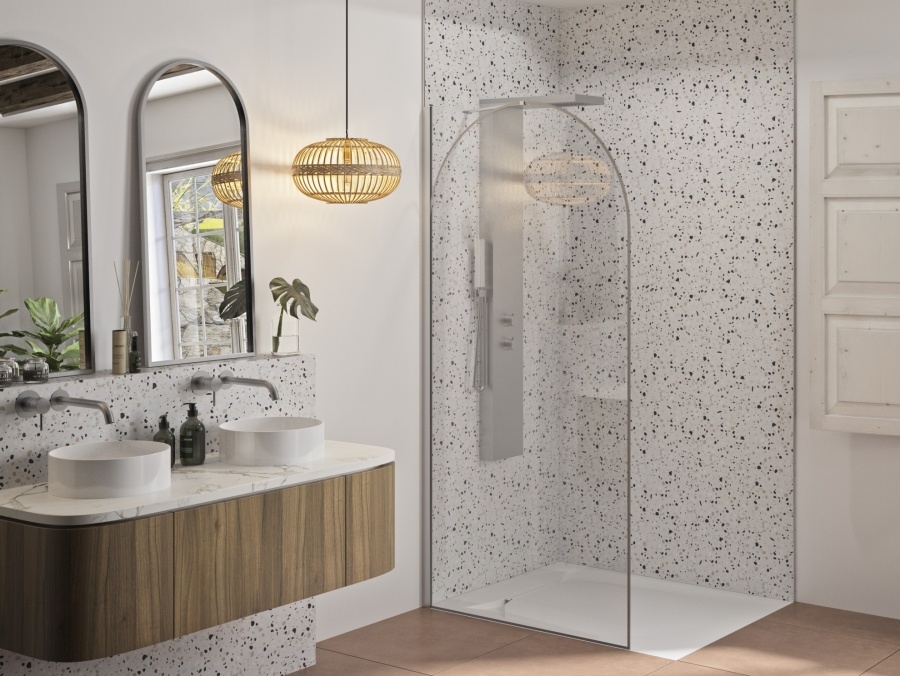 La paroi Arkade rompt avec la monotonie des lignes droites. Sa courbe et sa sérigraphie en arche doré apporte une touche de noblesse et de douceur, créant un écrin luxueux pour votre espace bien-être. Sa structure fine mais robuste souligne avec précision la zone de douche tout en conservant une sensation d’ouverture et de légèreté.