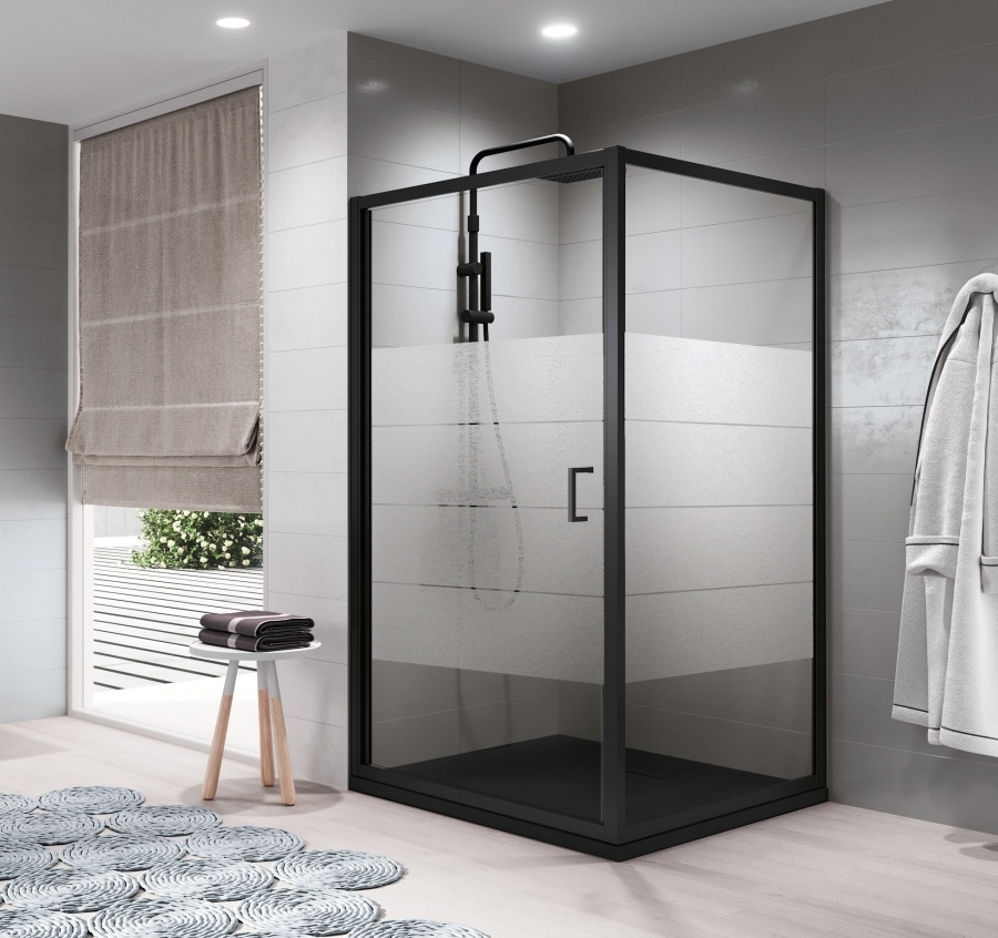 Porte de douche pivotante ZEPHYROS 2.0 G Noir Mat - Verre Strip - 90cm (Finition profils paroi : Noir , Taille Paroi douche : 90 cm , Type de verre Novellini : Bande Satin )