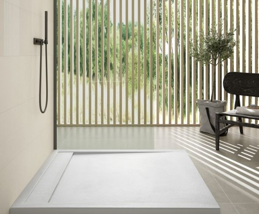 Receveur de douche en Acrystone, matériau composite haute performance qui améliore les propriétés de la résine minérale classique.