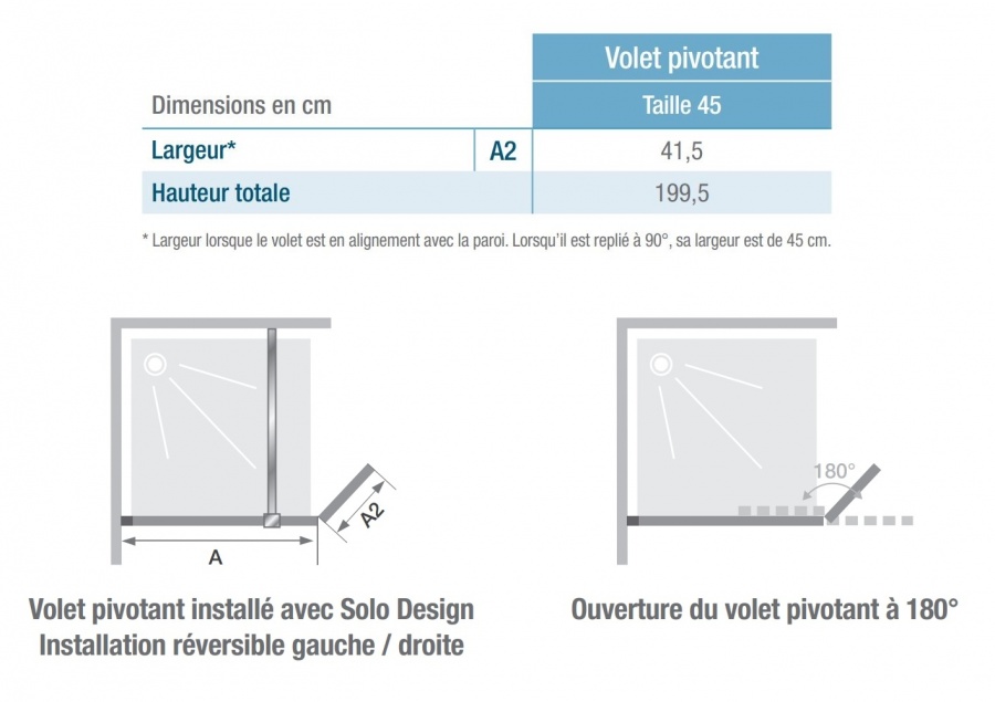 Vous pouvez également ajouter un volet pivotant avec une ouverture à 180°, qui permet de limiter les éclaboussures dans votre salle de bain, pour plus de praticité et de confort.